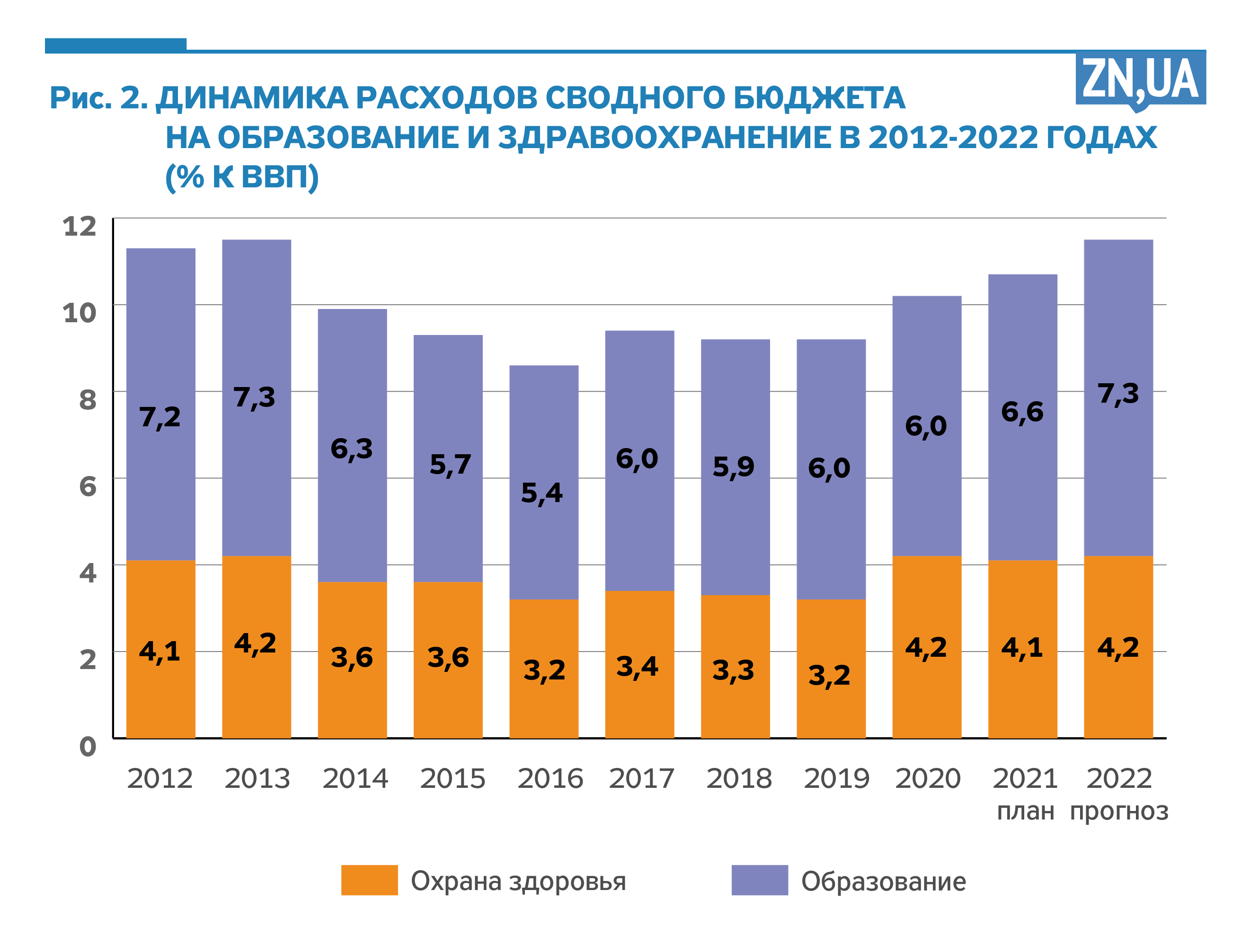 - образование (с 6,0% ВВП в 2020 году до 6,6% по плану на 2021-й и до 7,3% по прогнозу на 2022-й);