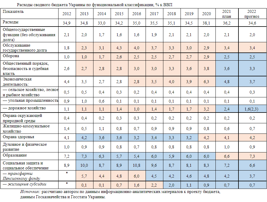 - социальная защита и социальное обеспечение (падение с 8,3% ВВП в 2020 году до 7,2% в 2021-м и до 6,6% в 2020-м);