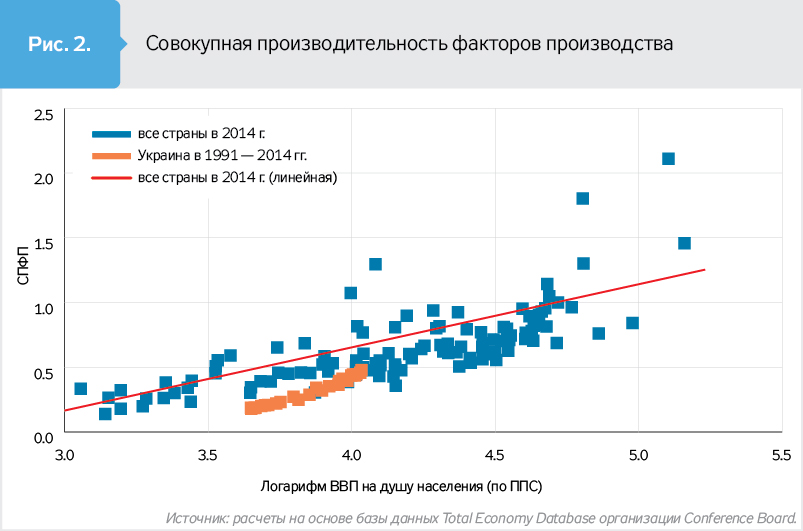 Несмотря на успех ряда реформ, эффективность использования труда, капитала и земли в большинстве отраслей производства в Украине остается очень низкой. Для понимания, сейчас на нашу страну приходится около 5% населения Европы и Средней Азии, но производит она всего 3% ВВП региона, поскольку Польша с приблизительно такой же долей населения производит 13% ВВП региона (см. рис. 4). И хотя размер капитала в Украине действительно ниже, чем в Польше, наибольшая разница между уровнями доходов в этих двух странах обусловлена разными путями использования этих факторов производства (см. рис. 5).