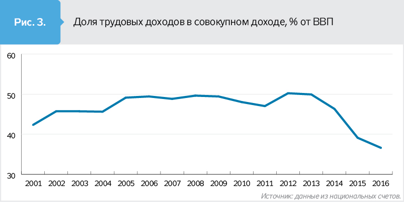 В завершение эксперты советуют Украине обратить внимание на проблему справедливого распределения дивидендов от экономического роста в обществе. Речь идет о так называемой инклюзивности экономики, которую текущая модель развития не обеспечивает. Глубокое падение экономики, пережитое нашей страной сразу после Революции достоинства, обесценение валюты и уменьшение текущих расходов государства привели к существенному падению имеющихся доходов у определенных категорий населения. Из-за этого доля трудовых доходов в совокупном доходе в Украине резко сократилась (см. рис. 3).