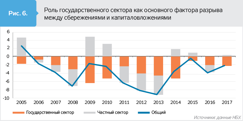 Усложняют ситуацию большие дисбалансы в государственном секторе, остающиеся главными факторами образования в Украине разрыва между сбережениями и капиталовложениями (см. рис. 6). По убеждению экспертов, рост потока кредитных ресурсов в пользу правительства "оттесняет" частный кредит, что дополнительно угнетает активность реального сектора экономики. Тот факт, что большая доля государственных расходов тратится на текущее потребление, а не на осуществление капиталовложений, делает последствия этого "вытеснения" еще более острыми.
