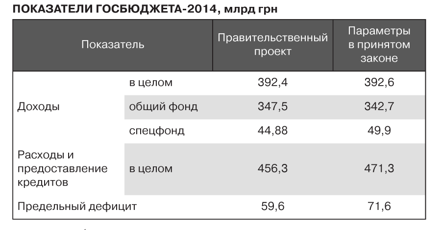 Окончательная версия госбюджета-2014 после обработки его в профильном комитете на момент подготовки этого материала еще не была обнародована. В то же время, согласно данным Минфина, депутаты увеличили дефицит госказны на 12 млрд грн (до 4,3% ВВП). Планируемые доходы выросли лишь на 0,2 млрд грн, а расходы и объем предоставления кредитов - на 15 млрд (см. табл.). В заключении бюджетного комитета парламента к документу (его поправки, как отмечалось, учтены при его принятии) предусматривалось увеличение предельного размера госдолга на 4,4 млрд грн (до 584,5 млрд).