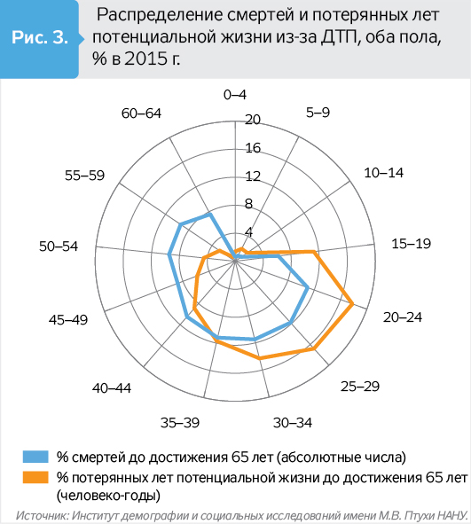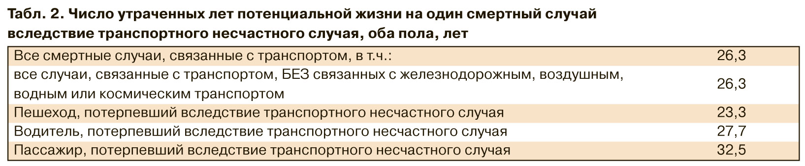 На основе данных Государственной службы статистики Украины с помощью метода потенциальной демографии рассчитано абсолютное количество потерянных лет потенциальной жизни из-за наступления преждевременной смерти от этой конкретной причины. На потери, обусловленные ранней смертностью в результате транспортных несчастных случаев, приходится довольно значительная часть - более 17% всех аналогичных потерь из-за внешних причин (то есть неприродных, или травм, отравлений, несчастных случаев и т.п.). По нашим расчетам, в 2015 г. все смертные случаи, связанные с транспортом, стали причиной потерь лет потенциальной жизни (ПЛПЖ), которые можно оценить в 108,74 тыс. человеко-лет (в 2013 г. - 128,18 тыс.).