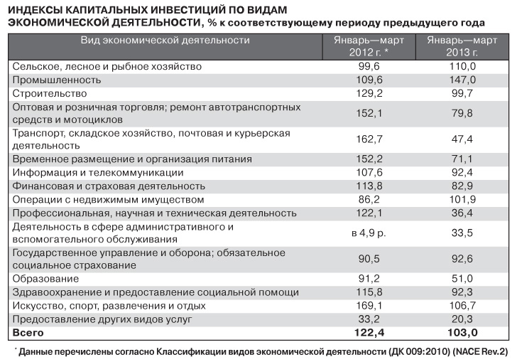 Начнем с официальной. Именно она, как многие справедливо считают, должна врать, как "сивый мерин", потому что "злочинна влада" всегда врет. Это правда, что врет, и, согласно последним данным Национального банка, в первом квартале 2013 г. (более свежие данные пока не опубликованы) капитальные инвестиции в Украине выросли на 3% (см. табл.). Отрасли, в которые потекли деньги, следующие: сельское хозяйство - 10%, промышленность - 47, искусство, спорт и сфера отдыха - 6,7, операции с недвижимостью - 1,9%.