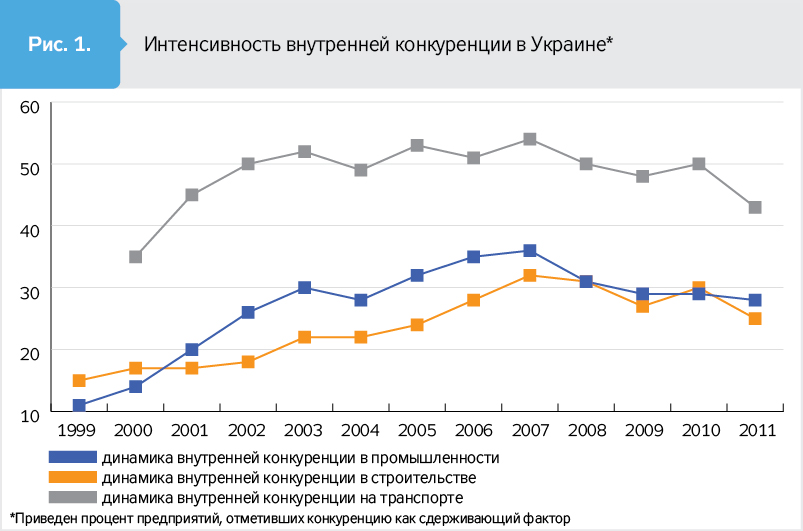 Статистические органы Украины регулярно проводят опросы руководителей предприятий, выясняя факторы, сдерживающие производство. Среди них - высокая конкуренция со стороны отечественных предприятий. Доля руководителей предприятий, отмечающих данный фактор, на наш взгляд, отражает интенсивность внутренней конкуренции. Предприниматели не очень любят конкуренцию, но она - типичное общественное благо, которое вынуждает их повышать эффективность, внедрять инновации.