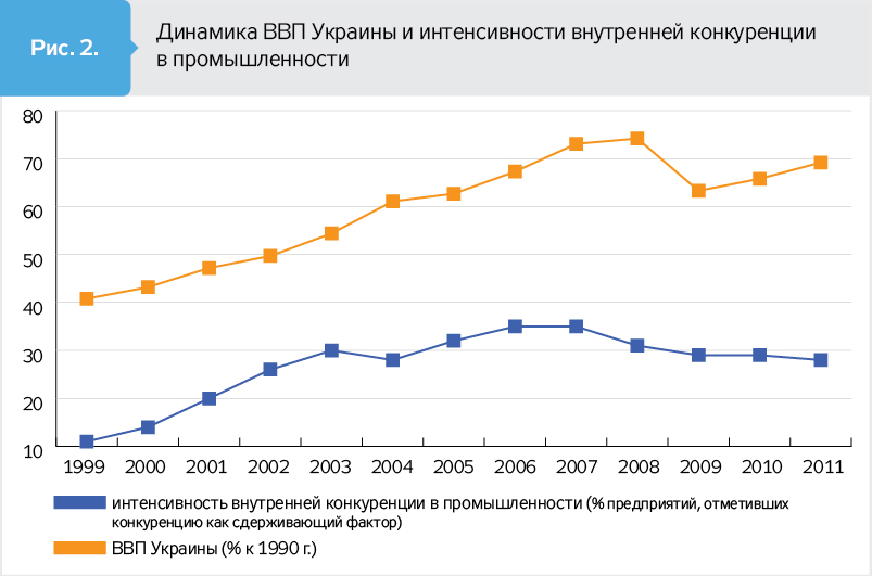 Важнейшей причиной падения производства в 2008–2009 гг. был мировой экономический кризис, но динамика конкуренции хорошо объясняет вялый рост после кризиса: в 2013 г. ВВП Украины был на 6,5% ниже, чем в 2008-м. Следует учитывать, что Портер считал ослабление внутренней конкуренции одной из важнейших причин утраты конкурентоспособности и сравнивал его с процессом гниения.