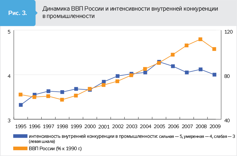 Именно усиление конкуренции стало, на наш взгляд, важнейшей движущей силой подъема, начавшегося в 2000 г. Это подтверждают данные о динамике интенсивности внутренней конкуренции и ВВП, приведенные на рис. 2. На указанном рисунке отражены данные о конкуренции в промышленности, но, как видно на рис. 1, ее динамика в важнейших отраслях близка.