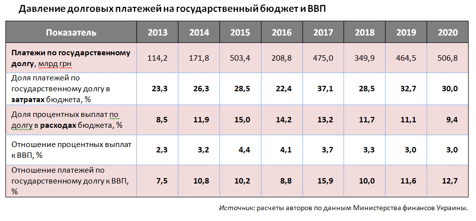Расходы на обслуживание государственного долга в 2020 году составили 121,1 млрд грн, или 3% ВВП, а общий объем выплат по погашению и обслуживанию долга — 506,8 млрд грн, или 12,7% ВВП (см. табл.). Высокое бремя обслуживания государственного долга в Украине является одной из причин критического состояния сферы здравоохранения в стране, постоянного недофинансирования сфер образования и социального обеспечения и чрезвычайно низкого уровня государственных капитальных вложений.