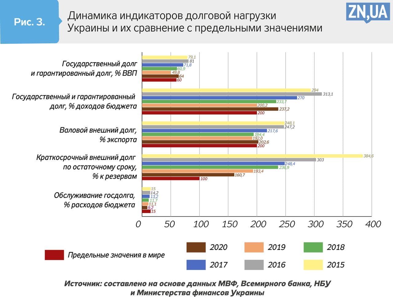 При текущем уровне государственного долга относительно ВВП (62,7%) Украина уже превысила традиционный предельный показатель для стран с формирующимися рынками — 60% ВВП. И хотя во многих развитых странах и странах с формирующимися рынками текущие объемы долгов также превысили эту отметку, это не отрицает факта ухудшения долговой состоятельности государства.