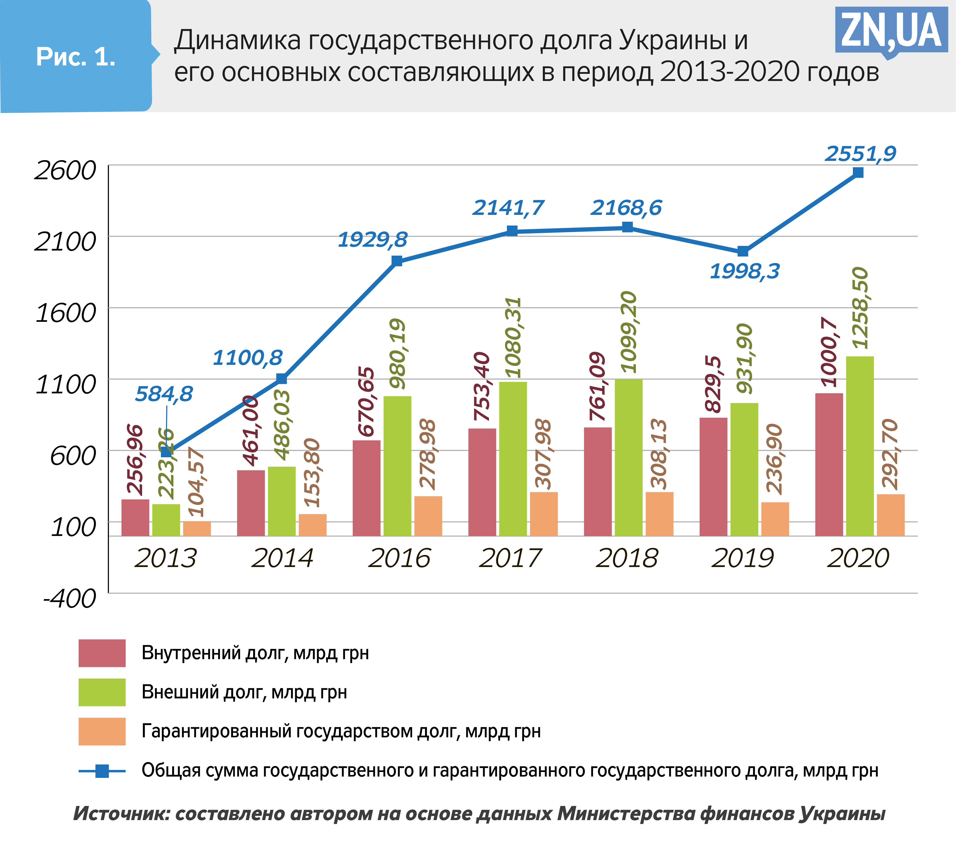 По состоянию на конец 2020 года сумма государственного и гарантированного государством долга в Украине достигла 2 551,9 млрд грн, или 90,3 млрд долл. США. За год указанная сумма, выраженная в гривнях, увеличилась на 553,6 млрд, а в долларах — на 5,9 млрд. В 2020 году основными компонентами нетто-прироста государственного долга стали: облигации внутреннего государственного займа (+171,4 млрд грн); займы международных финансовых организаций (+3,3 млрд долл.); облигации внешнего займа (+1,1 млрд долл). Динамика общей суммы государственного и гарантированного государством долга и ее основных составляющих начиная с 2013 года отображена на рис. 1.