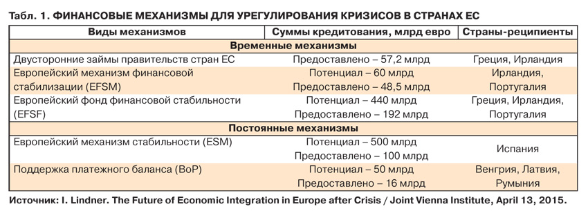 Среди новых членов ЕС после 2010 г. помощь в поддержку платежного баланса получили Венгрия, Латвия и Румыния в объеме 16 млрд евро. А за счет Европейского механизма стабильности Испания получила 100 млрд евро на стабилизацию финансового сектора. Греции, Ирландии и Португалии для урегулирования долгового кризиса было выделено 192 млрд из Европейского фонда финансовой стабильности. После начала долгового кризиса Греция и Ирландия привлекли 57,2 млрд евро займов на основе двусторонних соглашений с правительствами стран ЕС. Европейский механизм финансовой стабилизации стал источником для финансирования помощи Ирландии и Португалии в объеме 48,5 млрд евро.