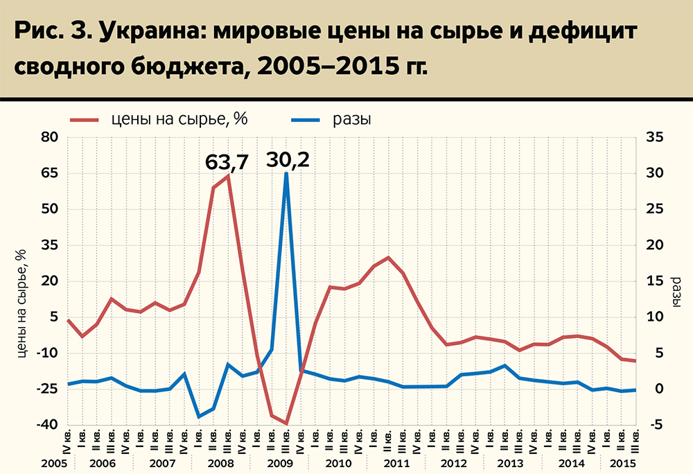 В 2009 г. 12-месячный провал сырьевых цен достиг 40%. Он повлек за собой падение на 20% (и более) реального ВВП, международных резервов и доходов сводного бюджета. Дефицит последнего вырос в 30 (!) раз (рис. 3).