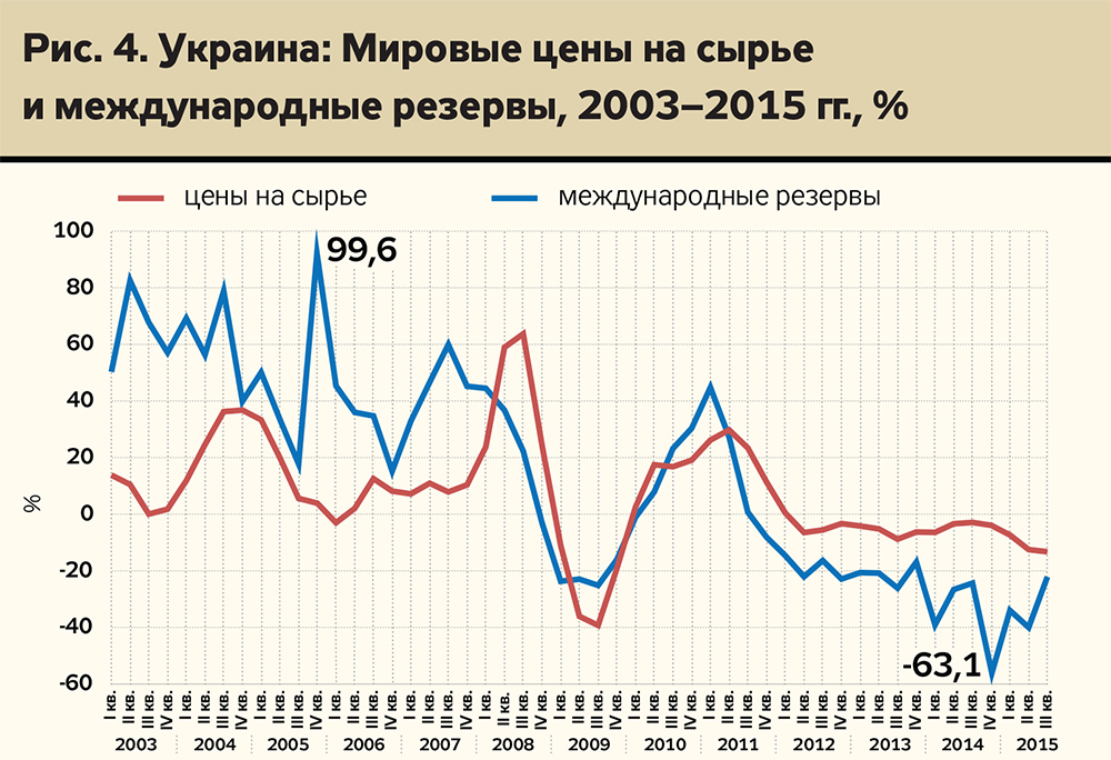 Его иллюстрацией служит годовая динамика цен на ключевые товары украинского экспорта: сталь, пшеницу, подсолнечное масло, азотные удобрения. Наложение на них аналогичных квартальных показателей реального ВВП, доходов/дефицита сводного бюджета и международных резервов наглядно объясняет причины взлетов и падений украинской экономики (см. рис. 1–4).