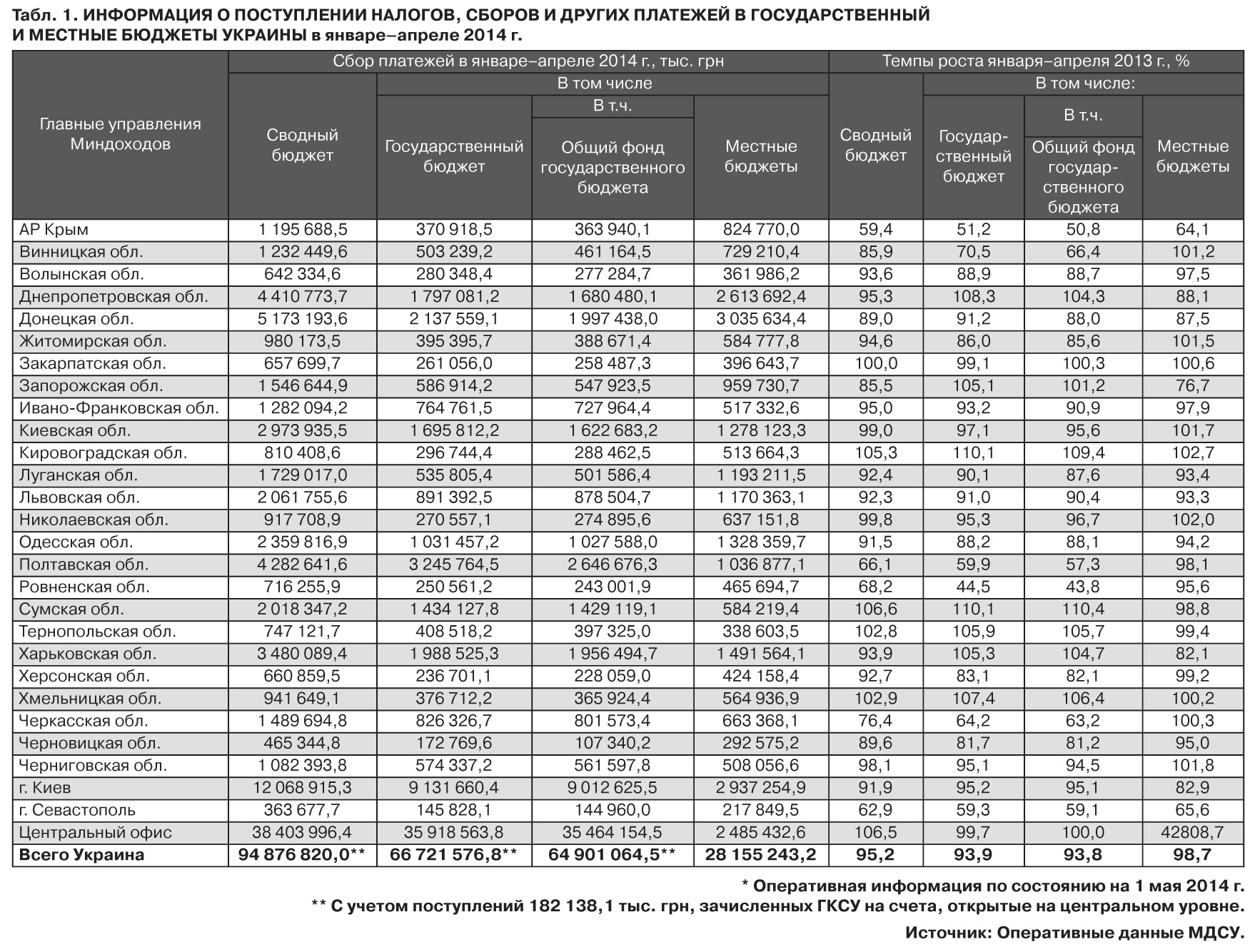 В распоряжении ZN.UA оказалась информация о поступлении налогов, сборов и других платежей в разрезе региональных управлений министерства (см. табл. 1). Налоговыми лидерами в январе-апреле с.г. оставались Киев (перечислено в общий фонд госбюджета более 9 млрд грн), Полтавская (2,64 млрд), Донецкая (почти 2 млрд), Харьковская (1,95 млрд), Днепропетровская (1,68 млрд грн) области. Однако в указанных регионах, кроме Харькова и Днепропетровска, роста доходов по сравнению с январем-апрелем 2013 г. не наблюдалось. Харьковская и Днепропетровская области - плюс 4,3 и 4,7% соответственно по общему фонду бюджета. Еще прирост есть всего лишь по шести регионам. Наибольший - по Сумской (+10,4%) и Кировоградской (+9,4%) областям. Отчисления более 1 млрд грн также обеспечили Киевская, Сумская и Одесская области.