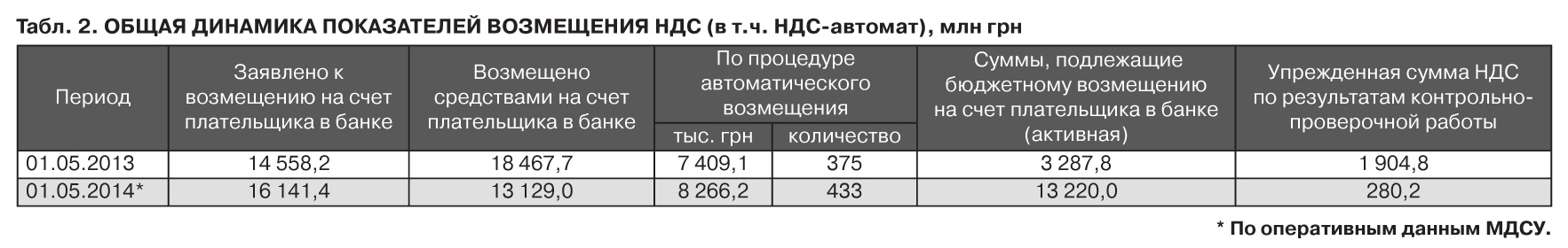 Поэтому и напоминают в очередной раз эксперты о необходимости более активно браться за ликвидацию теневых схем, налоговых ям, качественно усилить борьбу с налоговыми минимизаторами. "Они, может, что-то и делают, но по доходам бюджета этого не видно. Я понимаю, что два месяца всего новое руководство, но ликвидация схем сразу отражается на бюджете, - категоричен Дмитрий Боярчук. - Вспомните, когда в 2005 г. закрыли СЭЗы, бюджет начал сразу же достаточно активно наполняться". Хотя ряд собеседников ZN.UA все же отмечают, что порядок с возмещением НДС хоть какой-никакой, но наведен. По оперативным данным Миндоходов (см. табл.2), на 1 мая 2014 г. заявка на возмещение составляла 16,14 млрд грн, а сам возврат - 13,13 млрд, тогда как годом ранее возмещение налога превышало заявку почти на 4 млрд грн.