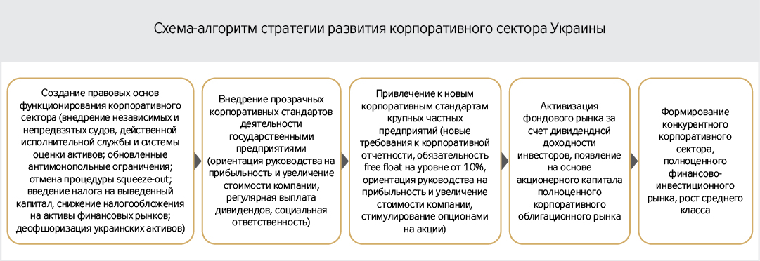 На мой взгляд, такие стратегические госпредприятия, как ПАО "Укрнафта", ПАО "Центрэнерго", ПАО "Турбоатом" и прочие, являются основой для формирования отечественного фондового рынка и должны быть примером для других акционерных обществ по внедрению современного корпоративного управления. Частным ФПГ необходимо дать четкий сигнал о необходимости отойти от горизонтального расширения. Вместе с тем сфокусироваться на ведущей профильной деятельности по внедрению прозрачных стандартов отчетности, отказаться от сокрытия доходов и прибыли (выплата регулярных дивидендов в Украине), что будет компенсироваться ростом стоимости активов в разы. Мною была разработана схема-алгоритм и предложено сформировать цивилизованный и конкурентный корпоративный сектор, содействующий экономическому развитию (см. схему).