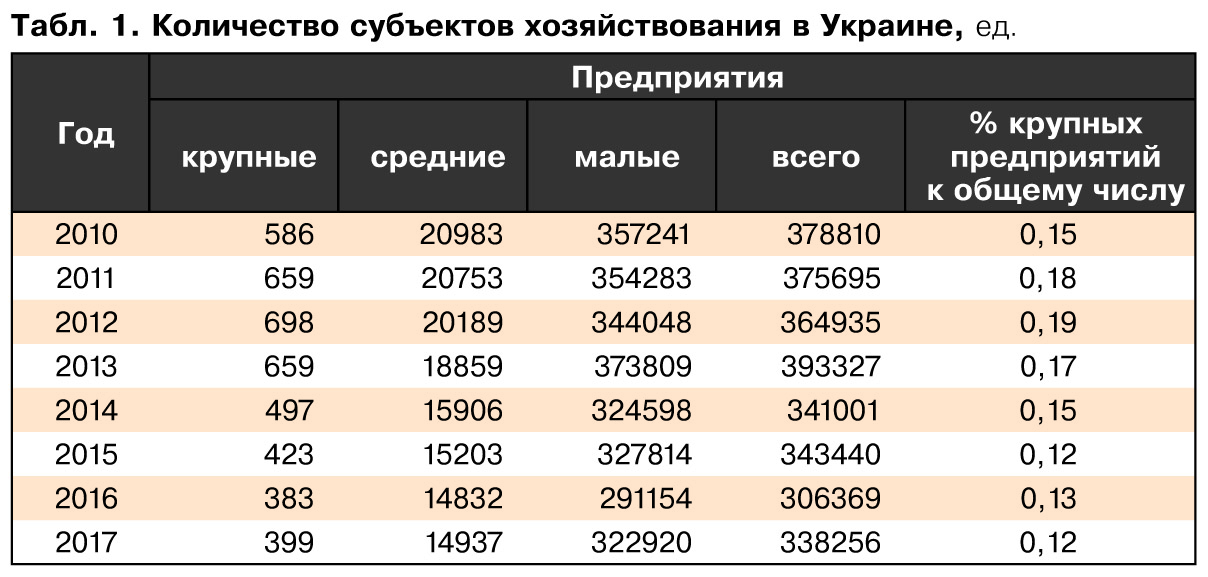 Украина прошла сложный путь формирования корпоративного сектора экономики, который, к сожалению, не стал примером качественных реформ и результатов. Проведение радикальных экономических реформ с начала 90-х годов ХХ ст. не привело к внедрению прогрессивной и сбалансированной модели социально-экономического развития. Эффективно действующие в странах Запада рыночные институты в украинских условиях оказались недейственными и малоэффективными, а старые неэффективные экономико-хозяйственные институты приспособились под новые кулуарно-частные интересы. На этапе становления корпоративного сектора Украины формальные и неформальные институты должны были создать действенный корпоративный механизм для привлечения отечественных и иностранных инвестиций, обеспечить возможности для активного роста бизнес-структур, но в реальности превратились во вспомогательные звенья при проведении непрозрачной приватизации и формировании олигархического капитала. Собственность крупных предприятий через разные махинации и теневые схемы получили приближенные к власти или криминалитету лица, которые не были заинтересованы в их развитии, а больше нацеливались на доминирование в определенном регионе или на властные кабинеты. Кроме того, высокие темпы инфляции в первые годы независимости Украины (1991–1995) и в дальнейшем периодические кризисы (1998, 2008–2009, 2014–2015) существенно снизили возможности для развития МСБ, его участия в росте и со временем трансформации в крупные предприятия.