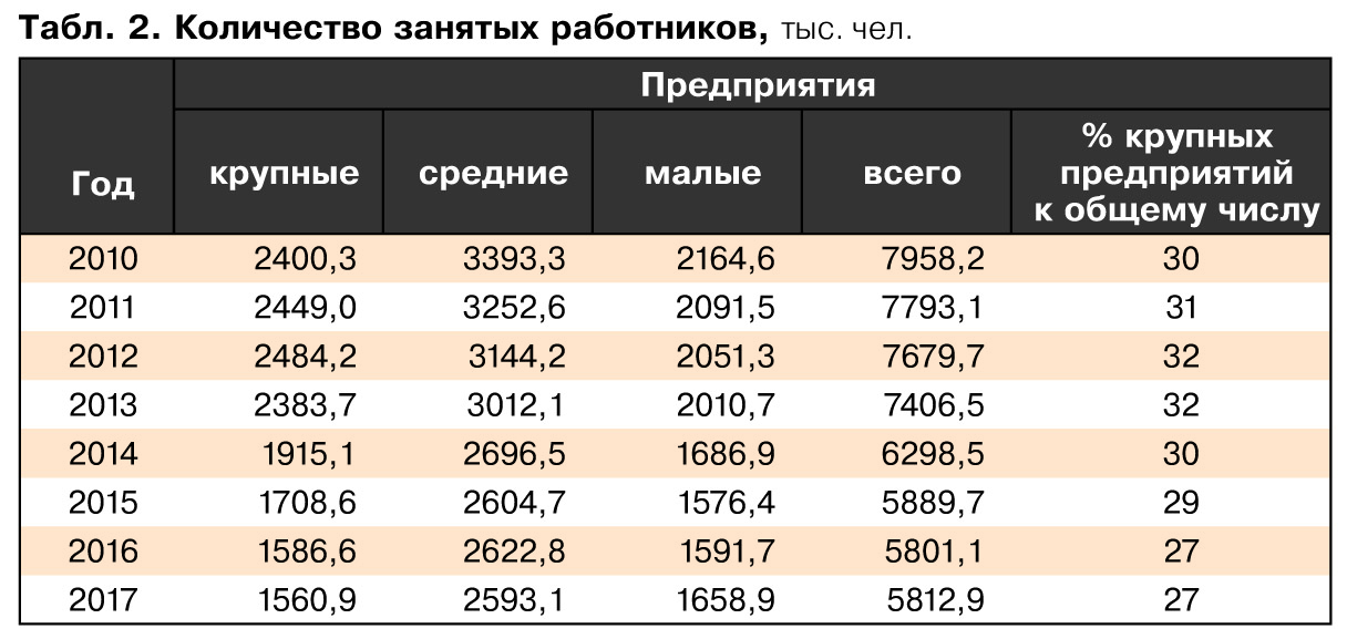 Количество занятых работников на крупных предприятиях также согласно вышеупомянутым процессам естественно снижается (см. табл. 2). Такие данные свидетельствуют о том, что усиления или экспансии отечественных крупных компаний на внешних и внутренних рынках не происходит. В целом по экономике наблюдается незначительный рост (ВВП Украины вырос на 2,5% в 2017 г. и на 3,1% в 2018-м). Сравнивая эти показатели с мировыми, отмечу стагнацию и отставание от мировой экономики. Так, рост мировой экономики составлял в 2017 г. 3,1% (развивающихся стран - 4,3%), в 2018-м - 3,8% (развивающихся стран - 5,1%). Кроме того, падение национальной экономики в 2014-м (-7%) и 2015-м (-10%) подтверждает выводы о том, что восстановления и системного роста за счет крупных предприятий не происходит.