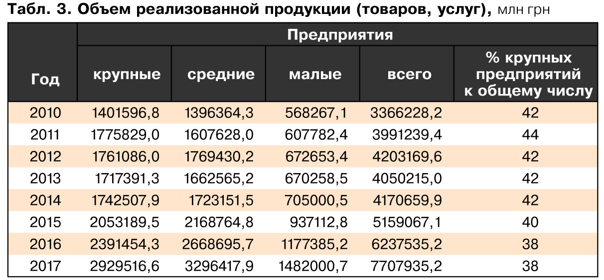 Замечу, что за 2007–2018 гг. удельный вес сельского хозяйства в экономике Украины увеличился более чем вдвое, а доля обрабатывающей промышленности снизилась в 1,5 раза. Дает о себе знать ограниченность или отсутствие крупных отечественных предприятий, функционирующих в высокотехнологичных отраслях (космос, электроника, робототехника, автомобиле- и авиастроение, разработка сверхсложных программных продуктов в сфере ІТ и искусственного интеллекта и т.п.). Но все же значение крупных предприятий в объеме реализованной продукции, особенно сырьевого сектора промышленности, больше, хотя также наблюдается тенденция к постепенному снижению их веса (см. табл. 3).
