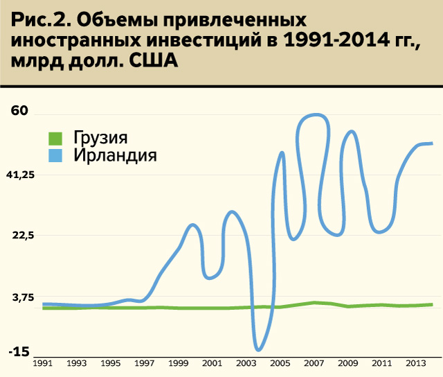 Казалось бы, Грузия - рай для иностранных инвесторов, легкости регистрации бизнеса и собственности. По некоторым показателям ей могут позавидовать даже французы, немцы, американцы. И вроде бы здесь должны запускаться новые стартапы, инвестировать транснациональные корпорации, а также корпорации из стран СНГ с авторитарными режимами (в первую очередь, из России, Казахстана, Азербайджана). Однако Грузия практически не получает иностранных инвестиций. По сравнению с Ирландией инвестиционная привлекательность (способность привлекать инвестиции) Грузии остается на крайне низком уровне. В то же время Ирландия с начала 2000-х стабильно привлекает от 30 до 50 млрд долл. инвестиций в год. За этот период иностранные инвестиции в Грузию лишь пять раз превышали 1 млрд долл. и ни разу не достигали 2 млрд. Выходит, что для улучшения инвестиционного климата стране подойдут одни специалисты, а для реального привлечения иностранного капитала нужны совсем другие эксперты.
