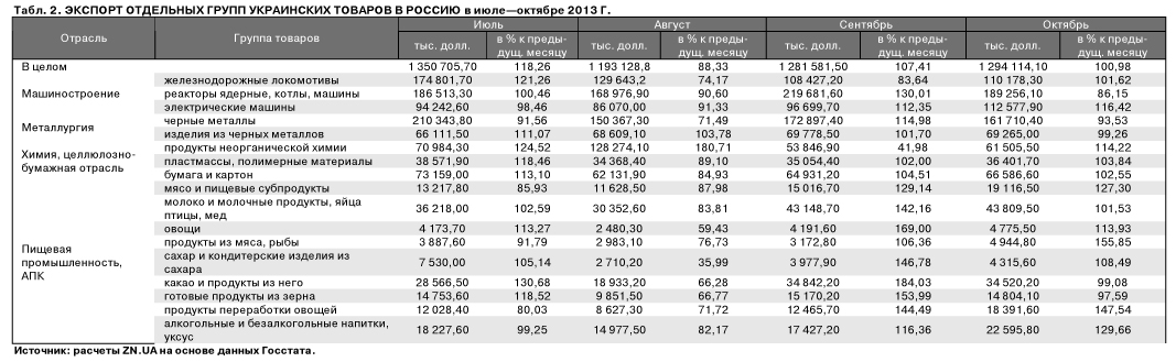 По данным Госстата, в августе-2013 по сравнению с июлем-2013 на 35–60% сократился экспорт кондитерской продукции и овощей, на 20–30% - железнодорожных локомотивов, черных металлов, "молочки", продуктов из мяса и рыбы, алкогольных и безалкогольных напитков (табл. 2).