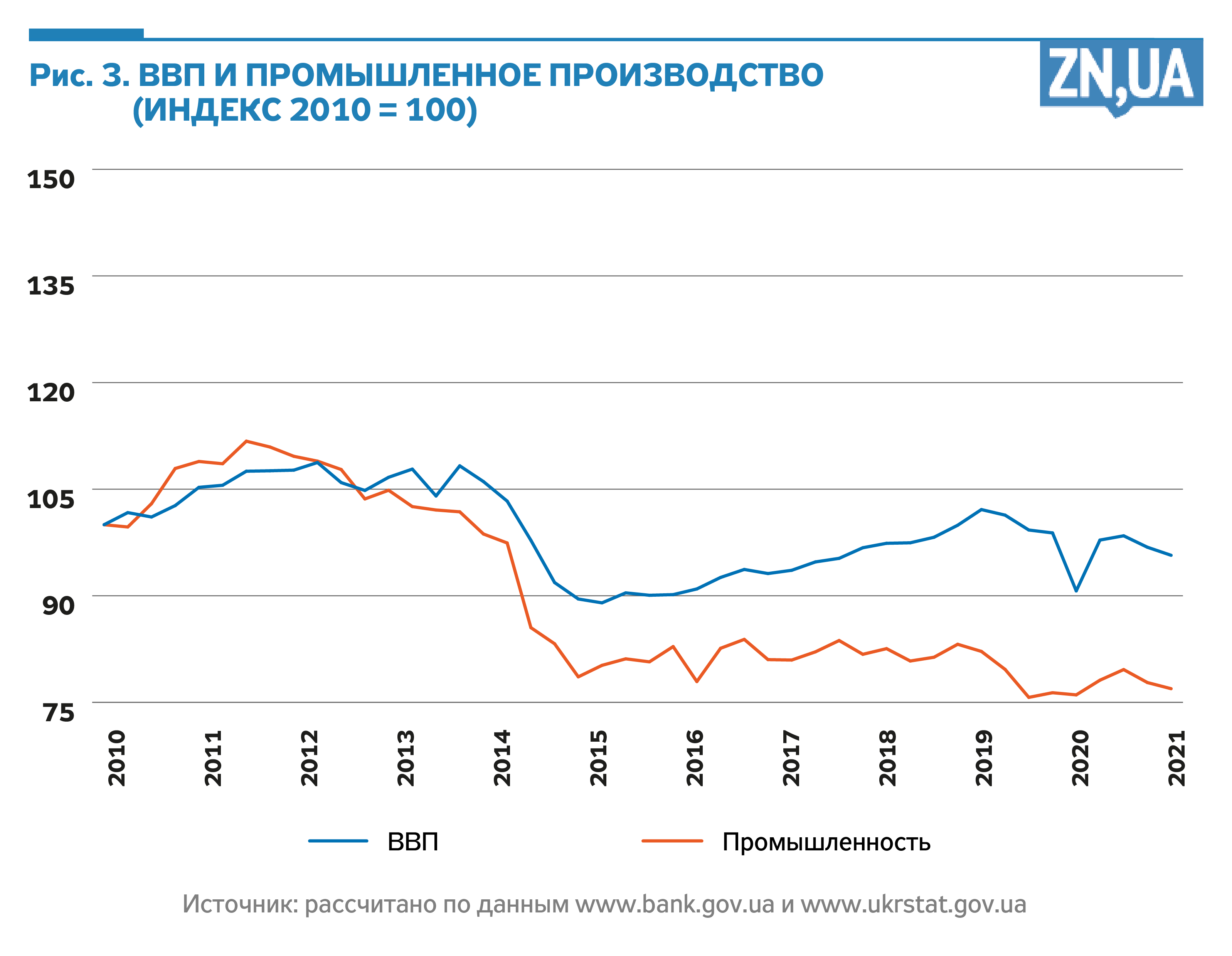 Объяснений ускорения инфляции может быть много, но причина всегда только одна: излишек денежной массы, который «преследует» недостаточное количество товаров. Денег в Украине стало значительно больше (см. рис. 1), что ускорило инфляцию (см. рис. 2), но не помогло ни росту ВВП, ни восстановлению промышленного производства (см. рис. 3). Излишек денежной массы (или денежный «навес») образца 2020–2021 годов стал очередной иллюстрацией монетарных аксиом, которые по тем или иным причинам в Украине действуют намного лучше, чем в странах с развитой рыночной экономикой. Это и дезориентирует многих отечественных специалистов, пытающихся найти решение украинских проблем в опыте США или стран еврозоны. Но ведь нет ничего более ошибочного. Мы не страна с резервной валютой, а НБУ — не Федеральная резервная система в ее сегодняшнем состоянии.