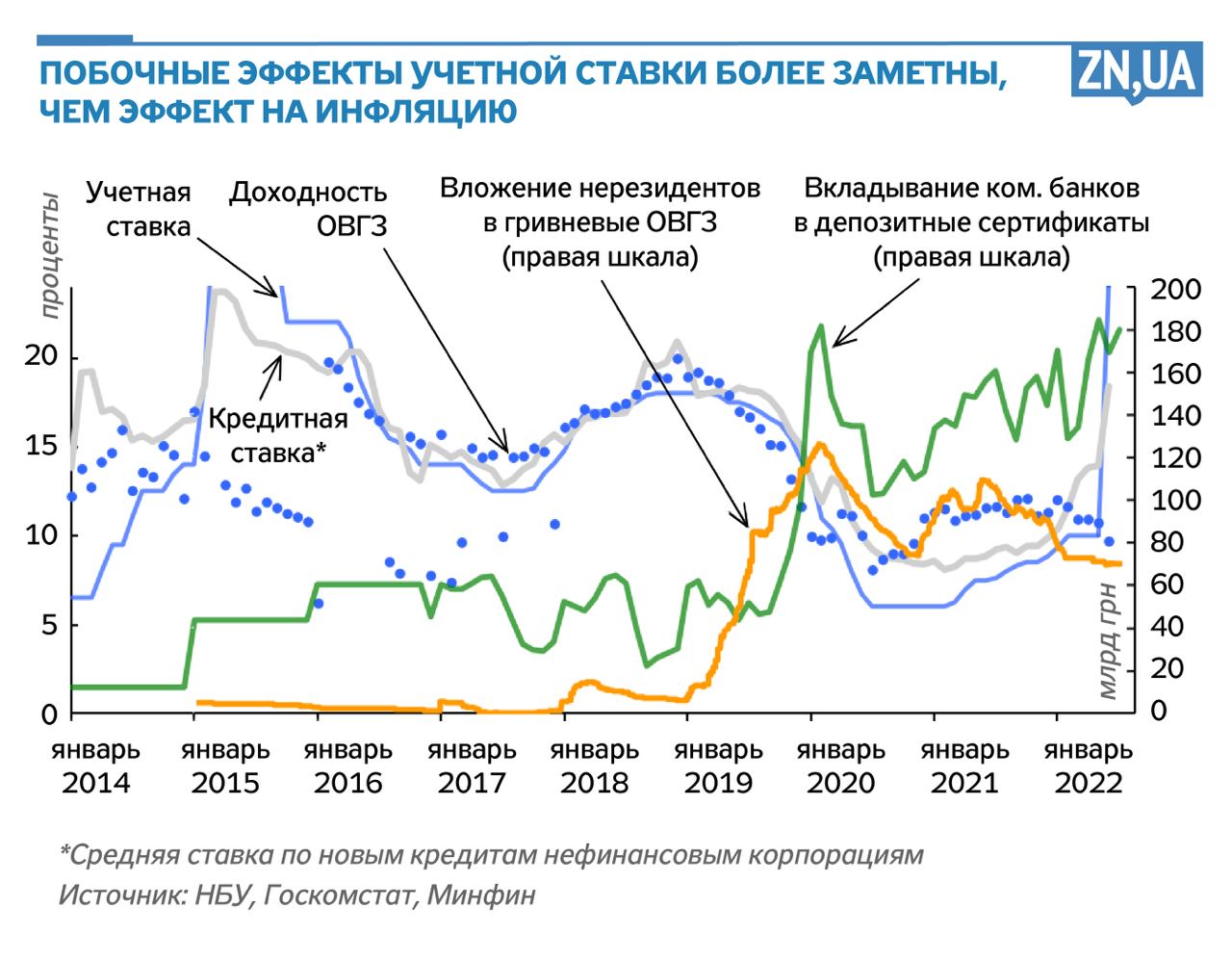 И также видно, как повышение ставки одновременно повышало доходность ОВГЗ. С 2016 года эта доходность начала подозрительно совпадать с учетной ставкой и ставкой коммерческих кредитов и даже иногда превышала последнюю, хотя ставки по облигациям должны быть меньше, поскольку государство является менее рискованным заемщиком, чем бизнес. Выгоду получили владельцы гособлигаций, и доля ОВГЗ, принадлежащих коммерческим банкам, тогда быстро выросла с 40 до 50%, а доля НБУ сократилась. Но это ослабило заинтересованность банков в кредитовании экономики.