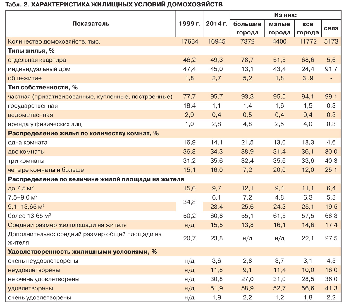 Информация по жилищным условиям очень выигрывает от выделения данных по большим и малым городам и сельской местности. В больших городах более трех четвертей домохозяйств проживают в квартирах и лишь 13% в индивидуальных домах. А в селах картина противоположная. В них основная часть жителей имеют собственные дома и только около 6% проживают в многоквартирных домах. Скорее всего, это наследие советских времен, когда в совхозах понемногу строились дома для специалистов. А в малых городах (а это и поселки городского типа) половина жителей живут в квартирах, а меньше половины - в собственных домах. В городах, особенно больших, еще около 4% домохозяйств до сих пор живут в общежитиях, которые преимущественно сохраняются еще с советских времен. И в них жилищные условия, конечно, намного хуже, чем в отдельных квартирах или домах. Хотя особенно в больших городах это могут быть и студенческие общежития. По характеру собственности на жилье сейчас уже почти все жители являются владельцами приватизированного, приобретенного (купленного) и самостоятельно возведенного (в сельской местности и малых городах) жилья. А в 1999 г., когда только начали проводиться нынешние обследования, еще 18% домохозяйств проживали в неприватизированных, находящихся в государственной собственности жилищах.