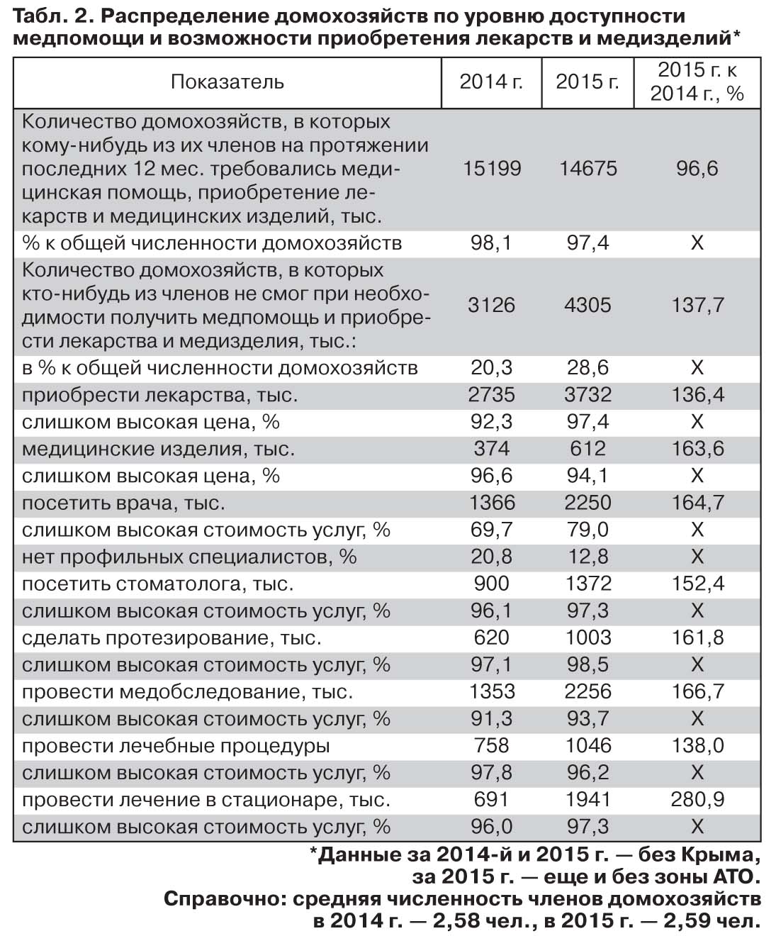 Основные данные этого блока за два года приводятся в табл. 2. Включение данных за 2014-й по сравнению с 2015-м, когда согласно данным Госстата реальная зарплата снизилась за год на 20,4%, сделано, чтобы показать, насколько это снижение сказалось на резком увеличении числа домохозяйств, которые из-за роста цен не могут себе позволить получение необходимой медпомощи и приобретение лекарств и медизделий. Число таких домохозяйств за год выросло сразу на 38% (!), а их доля в общей численности домохозяйств - с 20,3 до 28,6%. А по восьми приводимым в таблице видам медпомощи и возможности приобретения лекарств и медизделий оно выросло с 36% (приобретение лекарств) до 181% (лечение в стационаре). В разработках Госстата приводятся 3–4 причины, которые обуславливают невозможность получения медпомощи и приобретения лекарств. А именно: большие очереди, отсутствие специалистов нужного профиля, высокие цены и стоимость услуг, отсутствие свободных мест. Но по семи из приведенных в таблице видов медпомощи и приобретения медпрепаратов/медизделий более 90% "невозможности" их получения было вызвано их высокой стоимостью. И лишь в отношении посещения врачей эта цифра была ниже 90%, а вторым по значимости было отсутствие специалистов нужного профиля (в основном у сельских жителей).