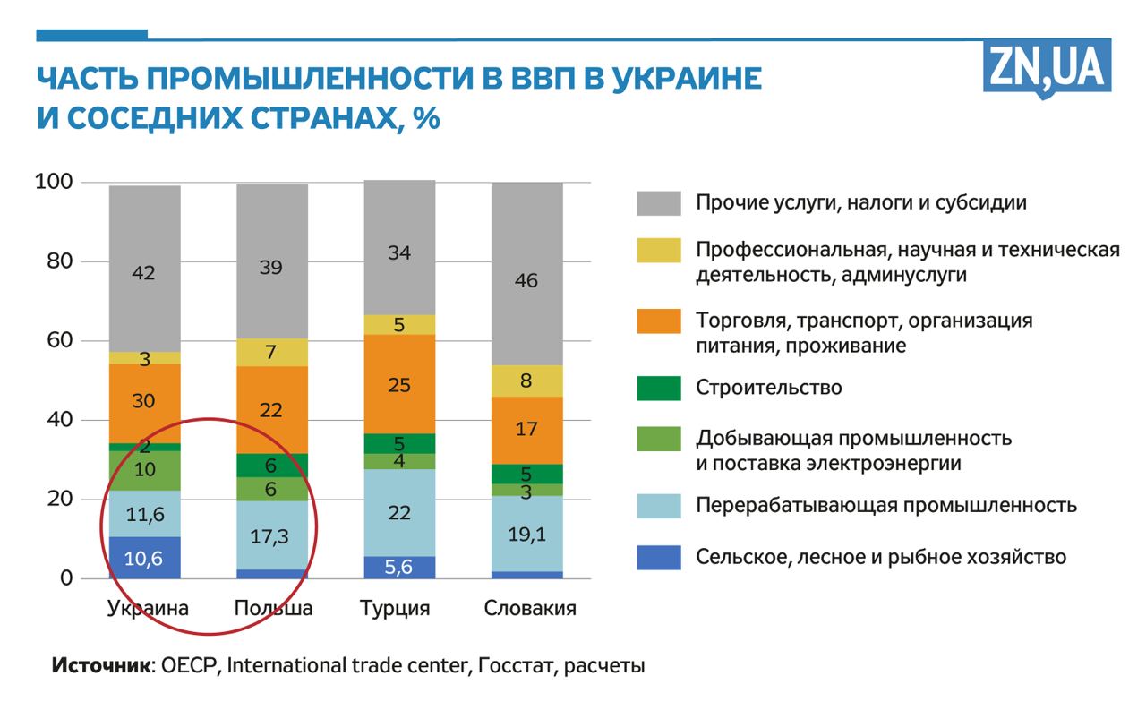 Картина этой разницы не может не вызвать еще один вопрос: почему так произошло и как это изменить? Поэтому следующая картина должна показать отличие в структуре экономик наших стран, а именно: значительно более низкую долю перерабатывающей промышленности в Украине.