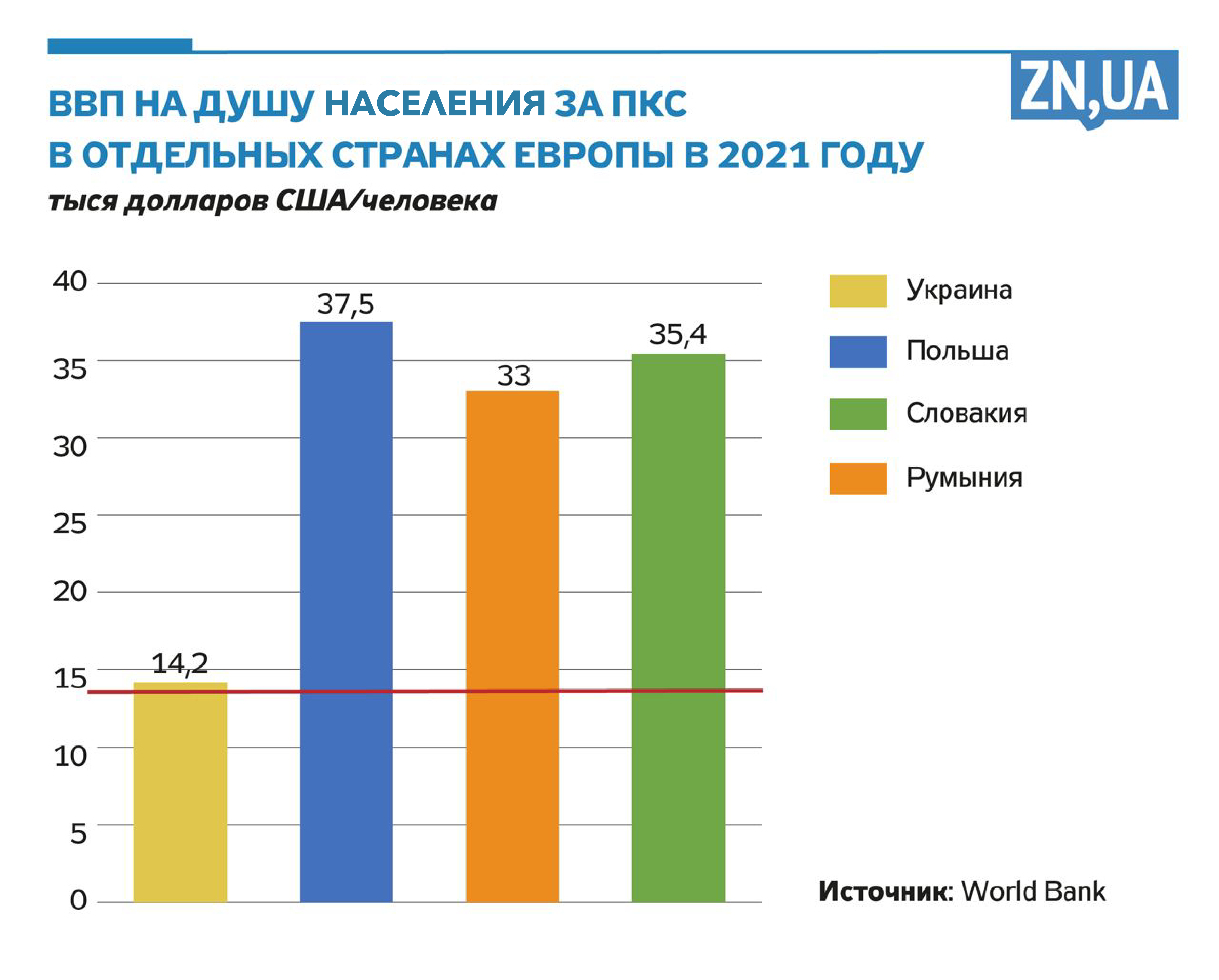 Вследствие этих ошибок самое богатое по ресурсам государство стало самым бедным по доходам среди стран Европы. В 2020 году годовой валовой доход на одного украинца по покупательному паритету, по данным Всемирного банка, составлял 13,8 тыс. долл. Для сравнения: в Молдове — 16,1 тыс. долл., в Польше — 35,8 тыс.