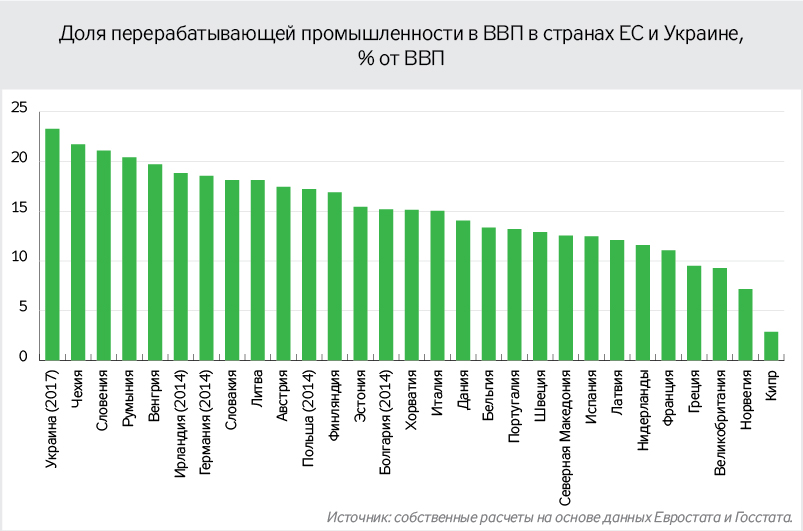Впрочем, роль промышленности в Украине была меньшей, чем в Китае, Корее и некоторых других азиатских странах. К тому же ВВП в промышленности формируется преимущественно в низкотехнологических отраслях, как, например, пищевая промышленность и горно-металлургический комплекс. Машиностроение в Украине по вкладу в экономику отстает от большинства стран ЕС, а в абсолютном измерении сформированный в этой отрасли ВВП сравним с аналогом машиностроительной промышленности в такой небольшой стране, как Словения. Поэтому с учетом в целом значительной роли промышленности в национальной экономике, для приближения уровня жизни в Украине к нашим западным соседям и сохранения конкурентоспособности отечественных товаров на мировом рынке необходимо существенно повысить производительность и качество промышленного производства.