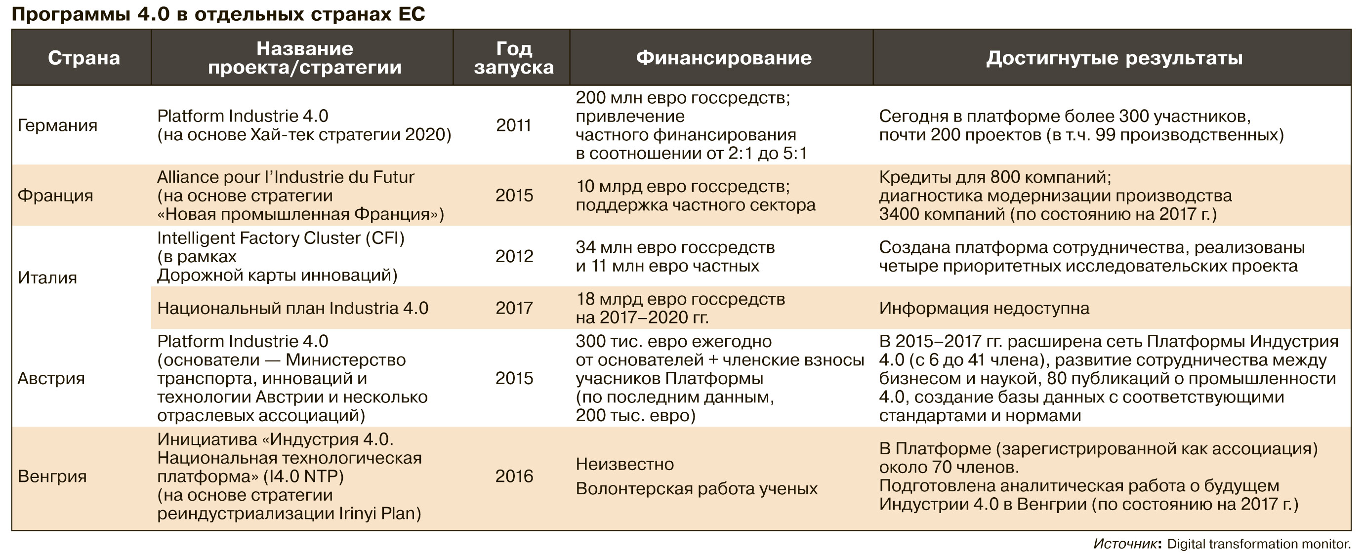 - акцент на развитии сотрудничества между заинтересованными сторонами. Например, в Германии и Австрии были запущены платформы Индустрии 4.0, объединяющие органы государственной власти, научно-исследовательские учреждения и бизнес;