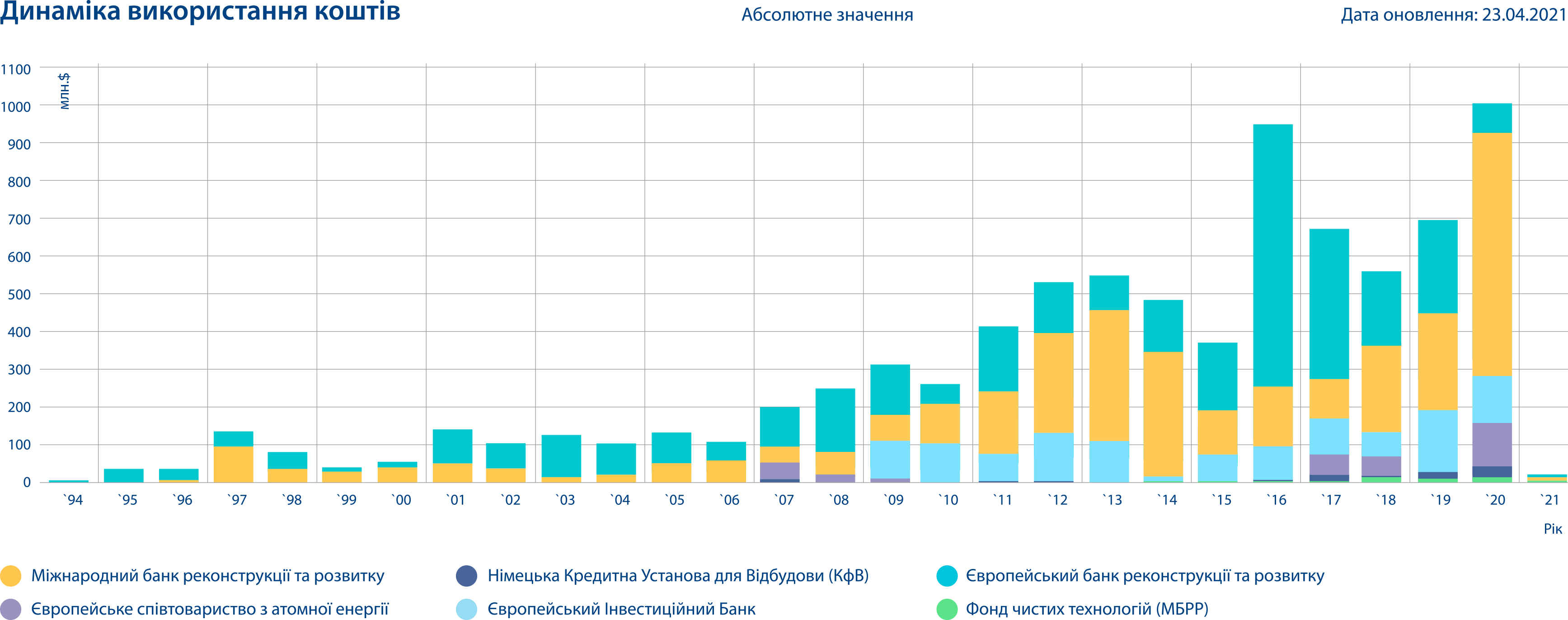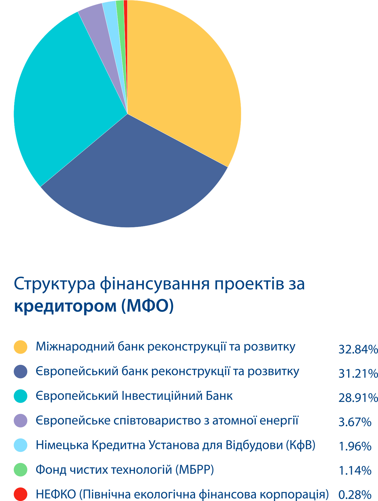 По официальным данным портала IFIs projects (реестр проектов МФО), по состоянию на 5 мая 2021 года текущий портфель МФО (в том числе KfW и Euratom) состоит из 41 проекта общей стоимостью 4,2 млрд долл. и 9,8 млрд евро, в частности это: