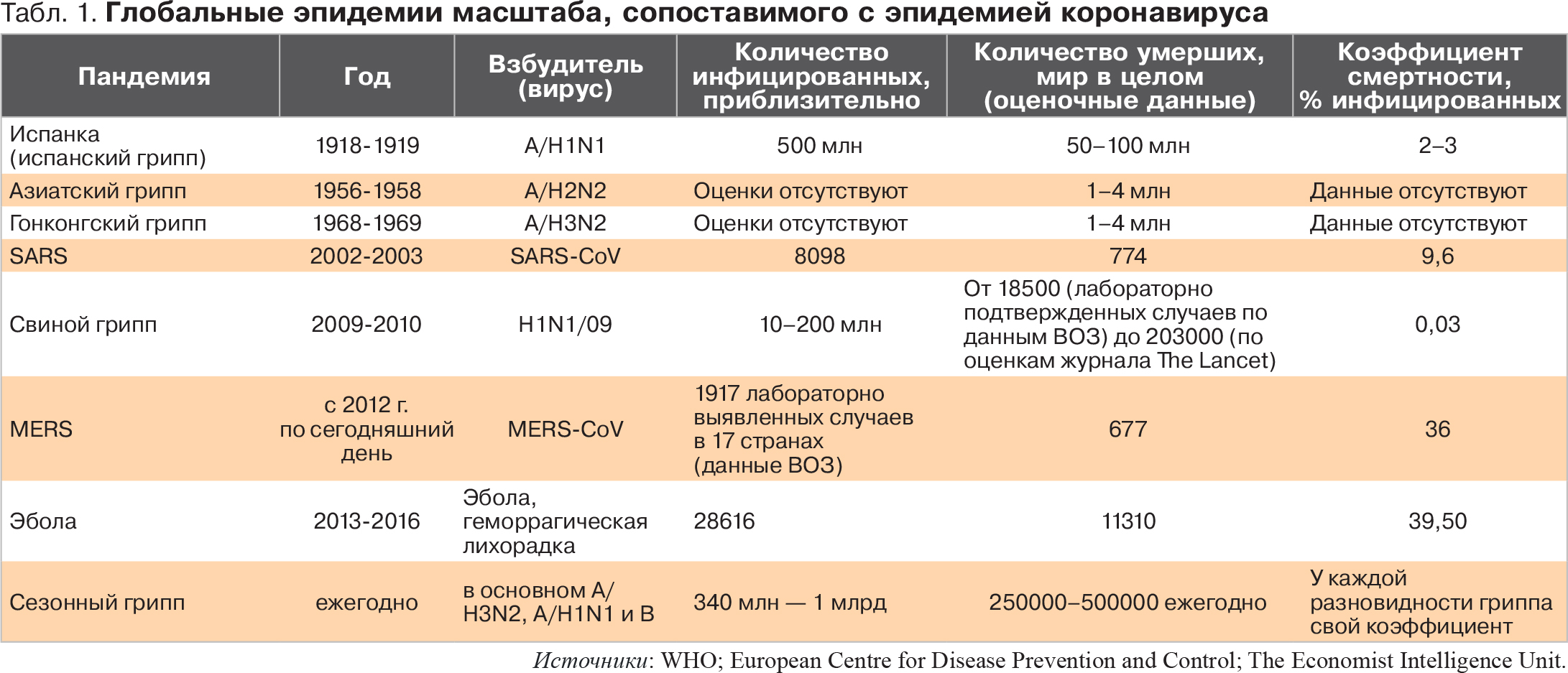 Для начала немного истории. Эпидемии всегда преследовали человечество (см. табл. 1). Приведенные данные свидетельствуют о том, что, несмотря на все наши ошеломляющие успехи в различных сферах, эпидемии являются реальной мировой проблемой, поскольку в стремительно глобализирующемся мире экономические, медицинские и другие проблемы отдельных стран и регионов могут быстро стать проблемами мирового сообщества.