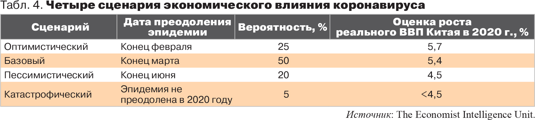 Эти данные показывают, какие именно секторы подверглись первому удару вируса и запустили цепь негативных экономических эффектов через внутренние и внешние производственно-коммерческие цепочки, в состав которых они входили. Затем можно анализировать отдельные секторы, отрасли, сегменты рынка и прочее с тем, чтобы детально описать все виды потерь. Такое исследование очень важно для детального понимания механики распространения соответствующих экономических шоков, но в этой статье ограничимся лишь оценкой влияния эпидемии коронавируса на экономику Китая в целом (см. табл. 4). Ну а выводы по этим данным каждый может сделать самостоятельно.