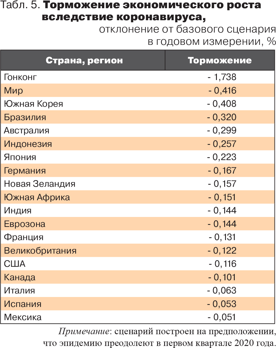 Сегодня практически все эксперты соглашаются с тем, что эпидемия отрицательно повлияет на мировую экономику. Но при этом преимущественно все расчеты строятся на предположении, что эпидемию преодолеют в первом квартале 2020 года, поэтому влияние будет ощутимым, но краткосрочным. Одна из оценок такого плана приведена в таблице 5.