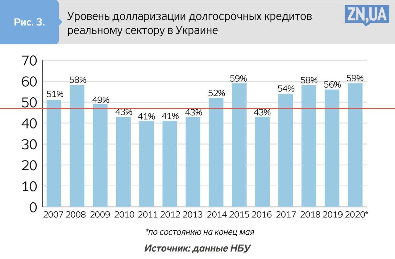 Чтобы убедиться, посмотрим на уровень долларизации долгосрочных кредитов (см. рис. 3). Доля долларизованных кредитов отклонилась вниз от среднего значения, опять же, в специфический период 2010–2013 годов. Учитывая данные рисунка 1, можно было бы сказать, что это свидетельство снижения курсовых рисков, которые принимает реальный сектор. Но на самом деле это не так. С одной стороны, можно выдвинуть гипотезу, что снижение доли долларизованных долгосрочных кредитов было отображением того, что кредитование инсайдеров происходило, скорее всего, в гривнях. То есть там, где кредитные риски были фактические, банки старались перестраховаться с помощью кредитования в иностранной валюте, а там, где риски были «контролируемые», достаточно было кредитования в национальной валюте. С другой стороны, именно на этот период приходится резкий рост внешнего долгосрочного долга реального сектора. То есть реальный сектор оказался не менее открытым к курсовым рискам, а более. Именно это объясняет, во-первых, почему в течение 2012–2013 годов НБУ упрямо сжигал резервы, а не ослаблял гривню в ответ на катастрофическое ухудшение платежного баланса. Во-вторых, почему падение курса в результате стало бременем не только для реального сектора, но и для банковского. Другими словами, внешние заимствования на фоне непроизводительных инвестиций и экспансия инсайдерских кредитов в итоге так или иначе затянули бы финансовую систему Украины в пропасть кризиса даже без шока военных действий и потери территорий в 2014–2015 годах.