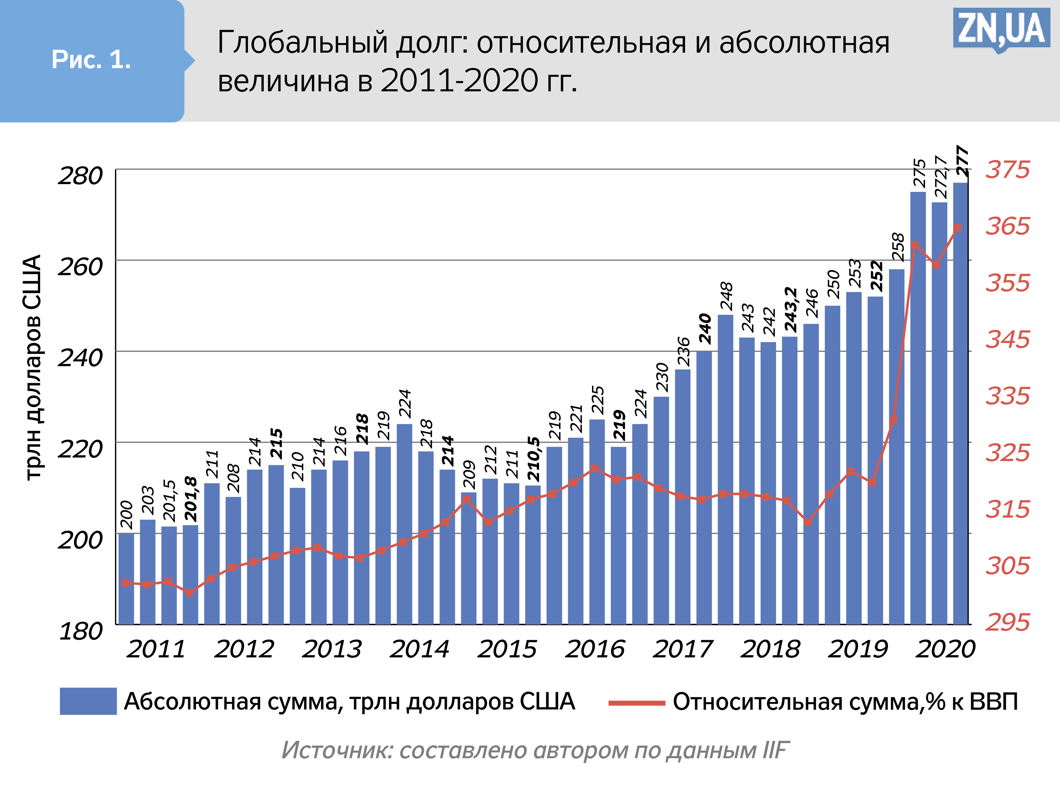 Сравнение кредитно-долговых показателей Украины с показателями других стран сигнализирует о низком уровне кредитования национальной экономики и дефиците внутренних рычагов кредитования частного сектора. Сумма глобального долга на конец 2020 года составляла 277 трлн долл. США, или 365% мирового ВВП (см. рис. 1). В Украине суммарный долг всех секторов экономики был немногим меньше 100% ВВП, отставая в 2,5 раза от среднего уровня в странах с формирующимися рынками и в 3,7 раза от среднемирового уровня.