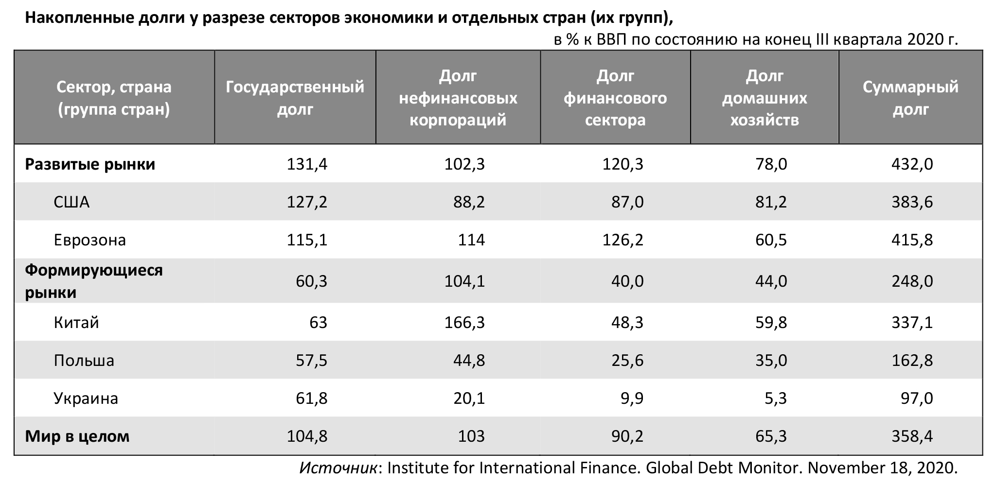 Как отмечалось, в Украине на конец третьего квартала 2020-го долг всех секторов экономики составлял чуть меньше 100% ВВП, отставая в 2,5 раза от среднего уровня в странах с формирующимися рынками. А внешний совокупный долг Украины на уровне 73,4% ВВП, наоборот, втрое превышал средний показатель для стран с низкими и средними доходами.
