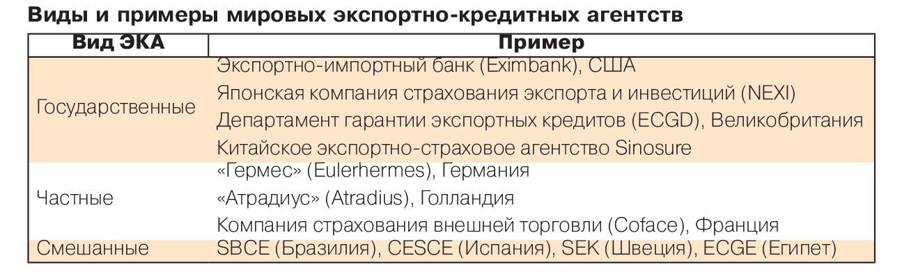 Учреждения по поддержке экспорта различной формы собственности действуют почти во всех развитых и активно развивающихся странах. На сегодняшний день ЭКА успешно функционируют в более чем ста странах мира. Самые известные среди существующих ЭКА: Eximbank (США), NEXI (Япония), Euler Hermes (Германия), COFACE (Франция), Atradius (Нидерланды), SBCE (Бразилия), CESCE (Испания), SEK (Швеция), Sinosure (Китай). Соответствующие учреждения созданы и в странах Восточной Европы, например в Чехии, Польше, Венгрии, Болгарии, Литве, Эстонии.