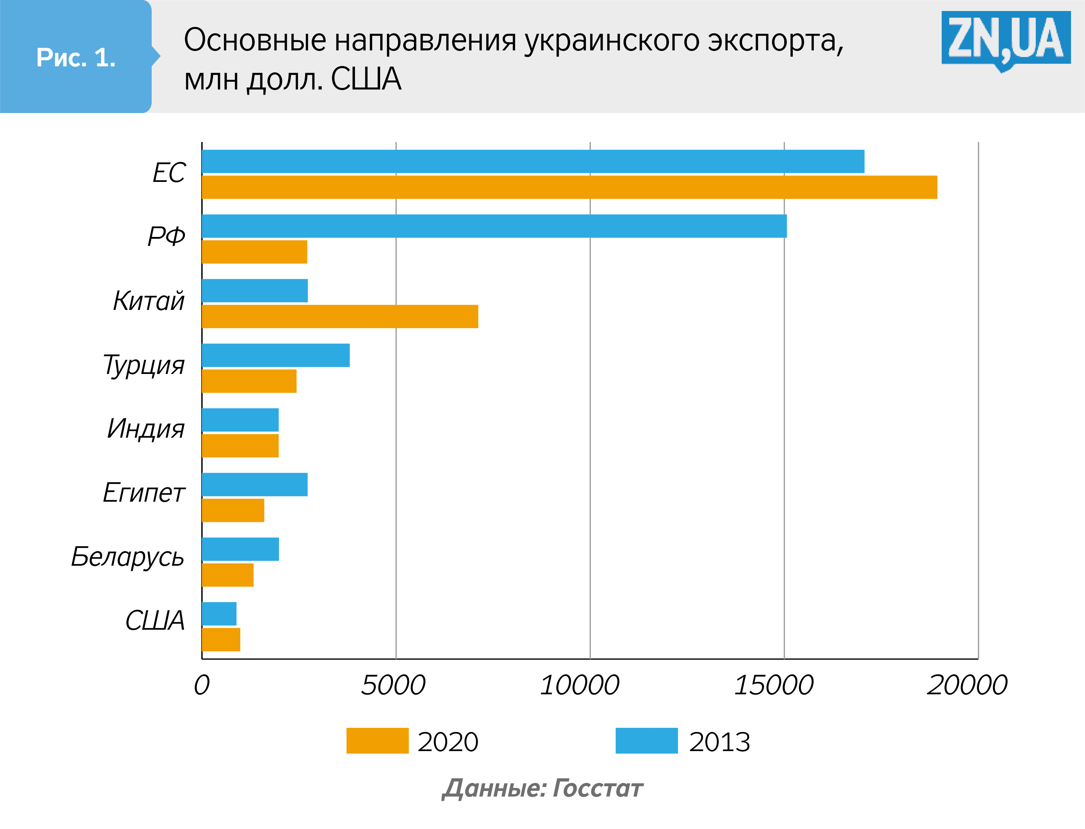 Накануне военного конфликта 2014 года украинский экспорт был довольно концентрированным. Десять наибольших направлений обеспечивали 58% всего экспорта, со значительным доминированием Российской Федерации, на которую приходилась почти четверть украинского экспорта. Экспорт в страны ЕС, вместе взятые, был всего на 10% выше. Самыми большими направлениями среди стран ЕС были Польша, Италия и Германия. Кроме того, в десятку самых значительных экспортных направлений также входили Турция, Китай, Египет, Казахстан, Беларусь и Индия (см. рис. 1).