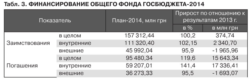 Ослабление гривни увеличивает госдолг Украины (см. табл. 3) за счет переоценки его валютной составляющей. По итогам 2013-го она была на уровне около 57%. По разным оценкам, в зависимости от глубины девальвации (10–20%) расходы на погашение и обслуживание госдолга в текущем году могут увеличиться примерно на 8–16 млрд грн.