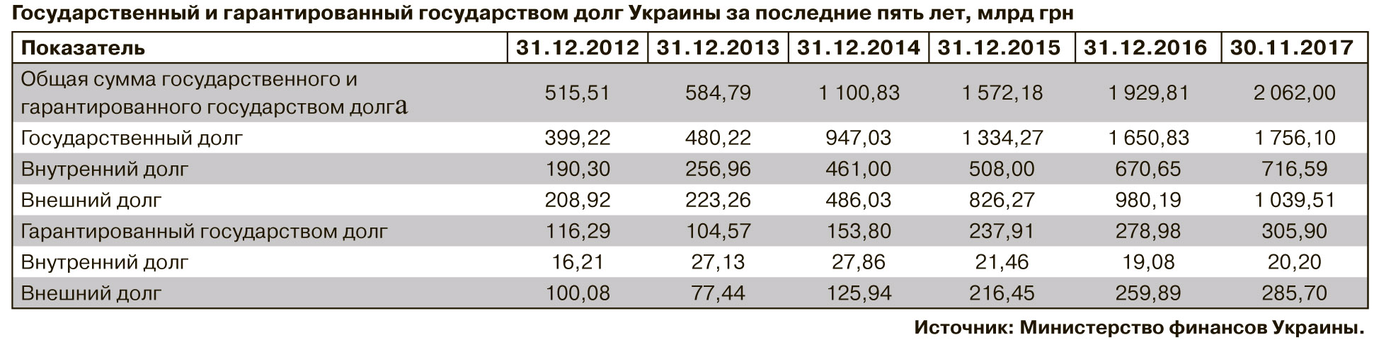 С 2014-го по 2016 г. госдолг вырос втрое и к концу 2016-го составил 1,65 трлн грн. Конечно, в долларовом эквиваленте эта цифра менее пугающая - 60 млрд долл., но рисков это не отменяет. На конец 2013-го долговые обязательства государства составляли 32,8% ВВП, в 2014-м - уже 59,7, к концу 2015-го - 67,1, а по итогам 2016-го - 69,3%. По оценкам Международного рейтингового агентства Moody's, в 2018 г. госдолг Украины будет на уровне 72,3% от ВВП. А общий внешний долг составит 104,6% от ВВП. Потребность в заимствованиях в общий фонд госбюджета в 2017–2019 гг. в соответствии с прогнозными расчетами Минфина составляет около 214,9 млрд грн в 2018-м и 258,6 млрд - в 2019-м.
