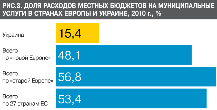 Конечно, о европейском качестве муниципальных услуг в условиях, где только 8,7% средств местных бюджетов направляется на эти цели, речь не идет. Именно направление в странах ЕС более половины средств местных бюджетов на собственно муниципальные услуги и самоуправляющееся управление этими процессами и создает такое высокое, пока недосягаемое для украинцев качество жизни в каждом европейском городе, городке или селе.
