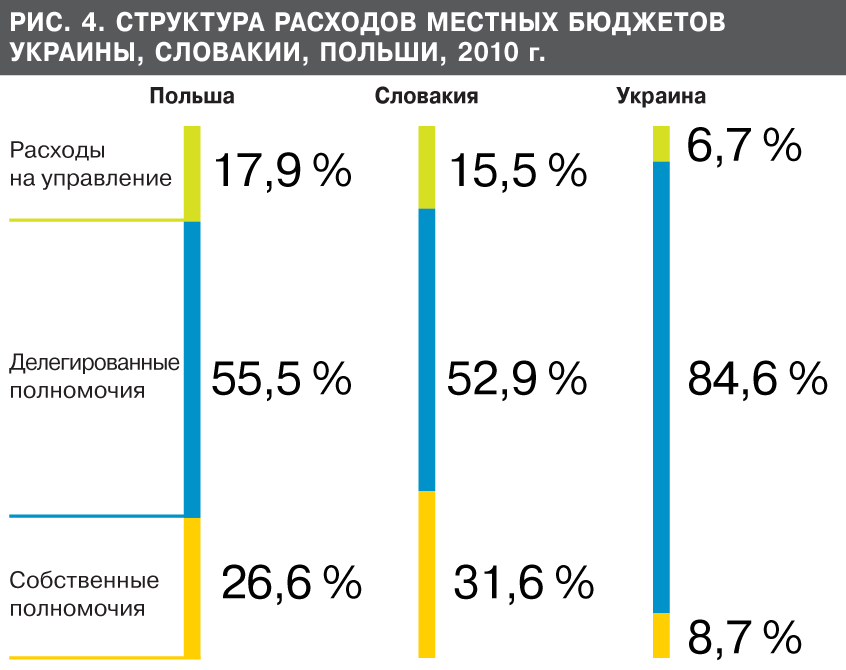 При этом доля расходов украинских местных бюджетов, направляемая на исполнение органами местного самоуправления собственных полномочий (жилищно-коммунальное хозяйство, благоустройство, транспортная сфера, содержание бюджетной и дорожной инфраструктуры, местные программы социально-экономического развития и т.п.), остается более чем в три раза меньшей, чем в странах ЕС (рис. 3, 4). Необходимо обратить внимание на то, что в Российской Федерации этот показатель приближается к общеевропейскому и в 2010 г. составлял 40,1% (в частности на ЖКХ - 18,3%, на управление - 8,9).