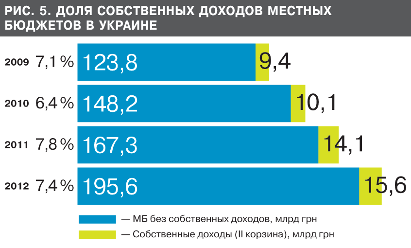 Мизерной остается в Украине доля собственных ресурсов в общих доходах местных бюджетов, которая на протяжении 2009–2012 гг. не превышала 8% (см. рис. 5). Именно собственные ресурсы направляются на обеспечение надлежащего качества жизни в населенном пункте - на благоустройство, жилищно-коммунальную сферу, обеспечение водой и т.п. Для сравнения: в странах ЕС этот показатель составляет от 30 до 70% (Великобритания - 37%, Германия - 46, Франция - 67%). Вот почему уровень и качество жизни в городе, городке или поселке Европы и Украины кардинально отличаются.