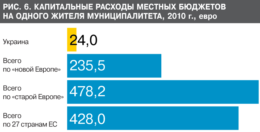 Показателем перспектив местного развития в любой стране являются объемы капитальных расходов местных бюджетов. В Украине местные бюджеты продолжают обеспечивать прежде всего только выплату заработной платы работникам бюджетных учреждений, оплату энергоносителей, льгот и субсидий населения, т.е. исполняют преимущественно функции "социального кошелька". В Европе органы местного самоуправления активно вкладывают средства в инфраструктуру и местное экономическое развитие. Объем капитальных расходов на одного члена европейской и украинской территориальной общины отличается в 18 раз!