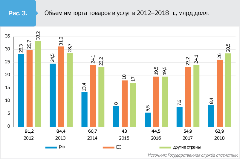 По сравнению с довоенным периодом общий экспорт страны уменьшился в 1,5 раза. При этом экспорт в РФ за годы войны снизился втрое, вместе с тем объемы продаж товаров в ЕС в 2018 г. превысили показатели 2012-го.