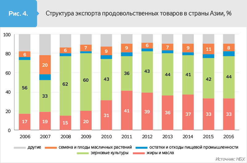 По данным обзора НБУ, азиатские рынки за последние годы стали крупнейшими потребителями украинских продовольственных товаров. В общем экспорте товаров Украины доля Азии выросла с 23% в 2006 г. до 36% в 2016-м, а украинский экспорт за это время увеличился в пять раз (см. рис. 4). Самые популярные товары - зерновые культуры, жиры и растительные масла.